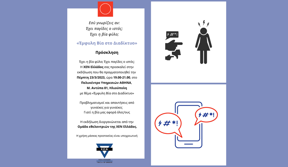 Η ΧΕΝ Ελλάδος σας προσκαλεί στην εκδήλωση που θα πραγματοποιηθεί την Πέμπτη 23/3/2023, ώρα 19:00-21:00, στο Πολυκέντρο Υπηρεσιών ΑΘΗΝΑ, Μαρίνου Αντύπα 81, Ηλιούπολη, με θέμα «'Εμφυλη Βία στο Διαδίκτυο».