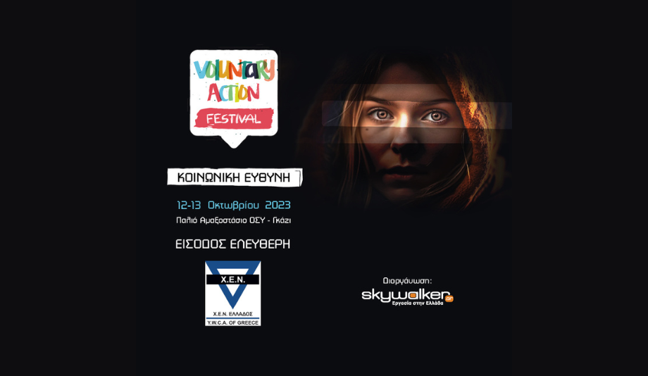 Με τη γνωστή φράση του Καζαντζάκη «Ν' αγαπάς την ευθύνη. Να λες: Εγώ, εγώ μονάχος μου, έχω χρέος να σώσω τη γης. Αν δε σωθεί, εγώ φταίω», το skywalker.gr ανοίγει για έκτη συνεχή φορά τις πύλες του και προσκαλεί το κοινό στο Φεστιβάλ Εθελοντισμού Voluntary Action 2023 – Κοινωνική Ευθύνη, στο Παλιό Αμαξοστάσιο ΟΣΥ στις 12 και 13 Οκτωβρίου 2023 (11:00-23:00) με ελεύθερη είσοδο. Σε έναν φυσικό χώρο συνάντησης και συνεργασίας ΜΚΟ, εθελοντών και πολιτών, σκοπός είναι η ανάδειξη του Εθελοντισμού στην Ελλάδα.