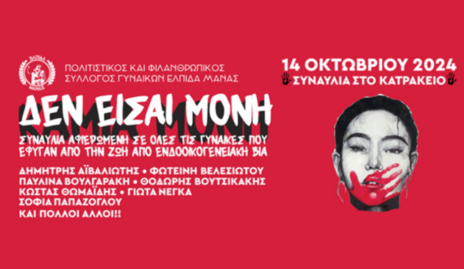 Την Δευτέρα 14 Οκτωβρίου 2024, στις 20:00 διοργανώνεται στη Νίκαια, στο «Κατράκειο» Θέατρο, συναυλία αφιερωμένη στην μνήμη όλων εκείνων των γυναικών που έχουν φύγει από την ζωή από ενδοοικογενειακή βία από τον Πολιτιστικό και Φιλανθρωπικό Σύλλογο Γυναικών «Ελπίδα Μάνας», με τίτλο «Δεν είσαι μόνη».