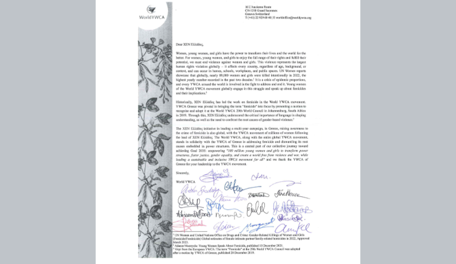 Το Προεδρείο και τα μέλη της Διοικούσας Επιτροπής της Παγκόσμιας ΧΕΝ με επιστολή τους στηρίζουν το αίτημα της ΧΕΝ Ελλάδος ώστε η γυναικοκτονία, η πιο ακραία μορφή βίας κατά των γυναικών, να αναγνωριστεί ως αυτοτελές ποινικό αδίκημα.